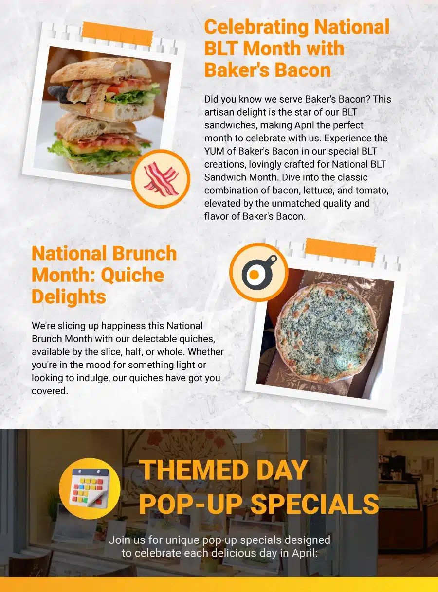 We serve breakfast, lunch, afternoon snacks, dinner, and sweet treats, with takeout via its online ordering platform